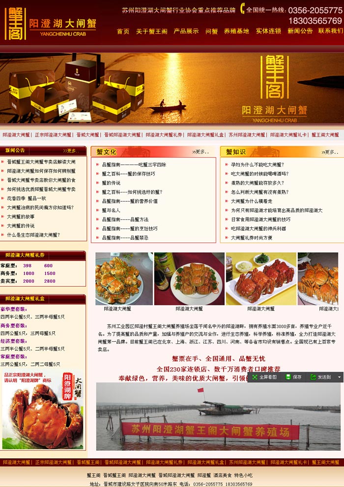 晉城陽澄湖大閘蟹-蟹王閣專賣店,提供正宗陽澄湖大閘蟹和大閘蟹禮券,我們應(yīng)對您不同的需求為您訂制了各種價位的大閘蟹券和包裝精美的大閘蟹禮盒。咨詢熱線:18303565769 網(wǎng)址http://www.jcsdzx.com |
